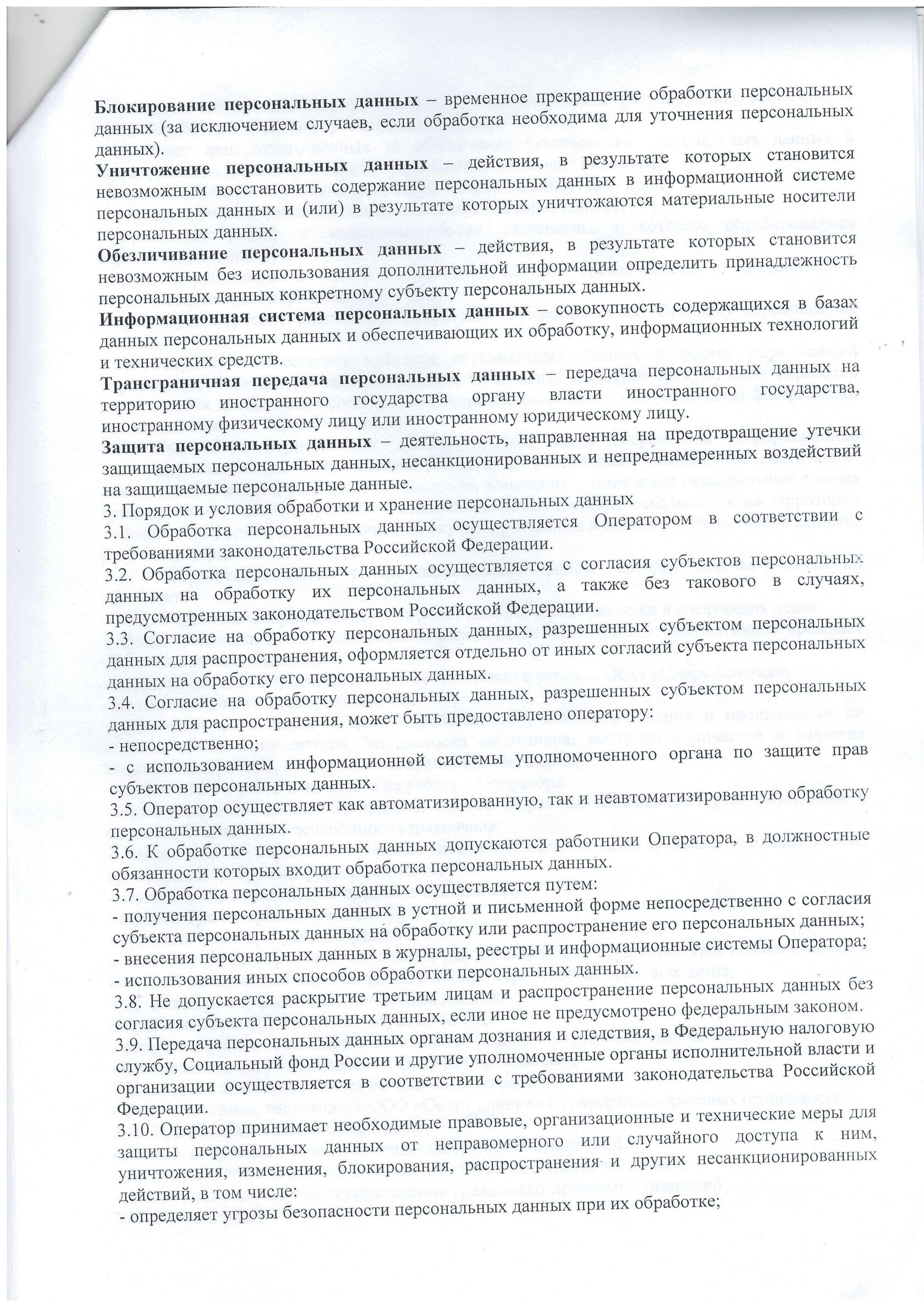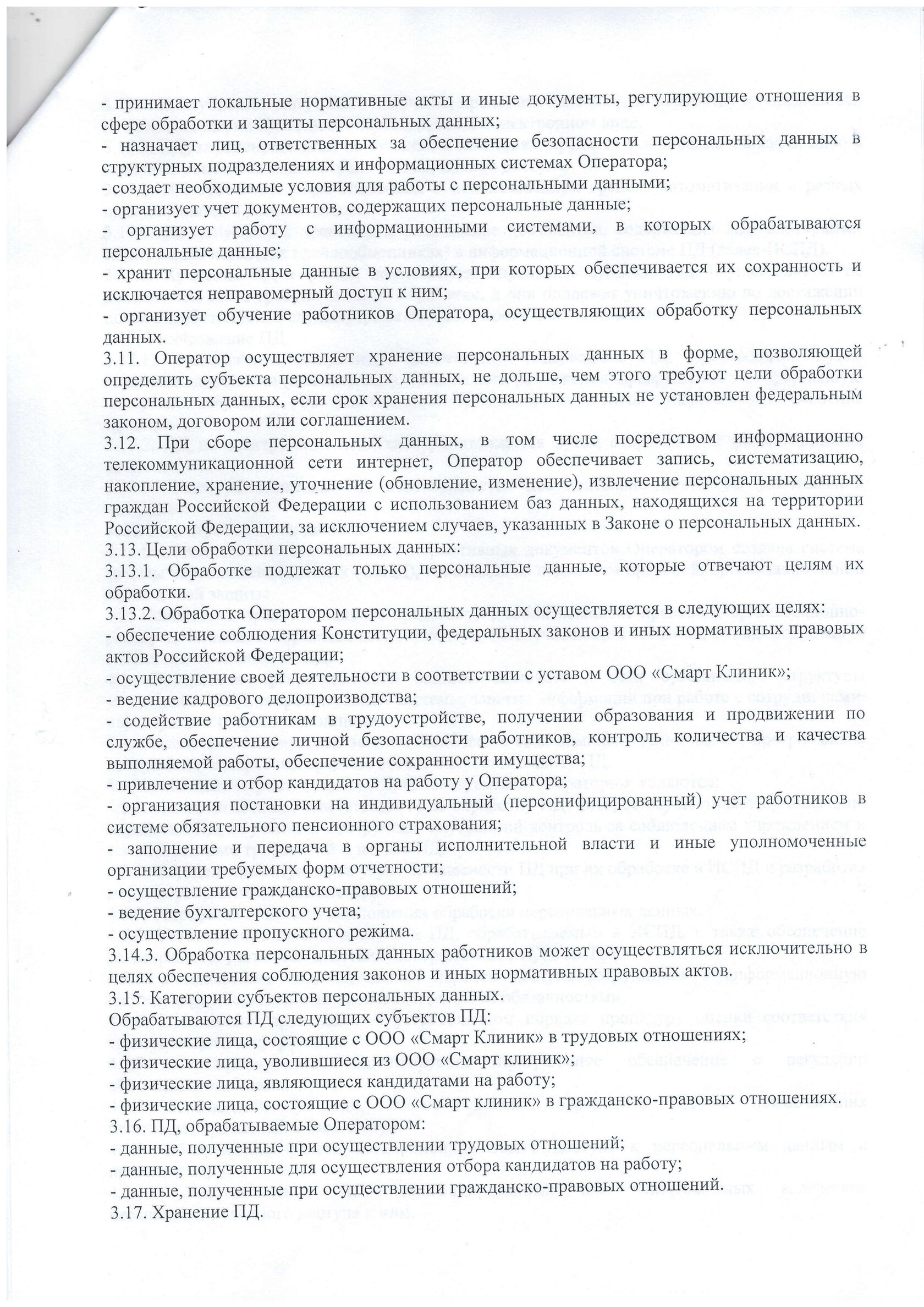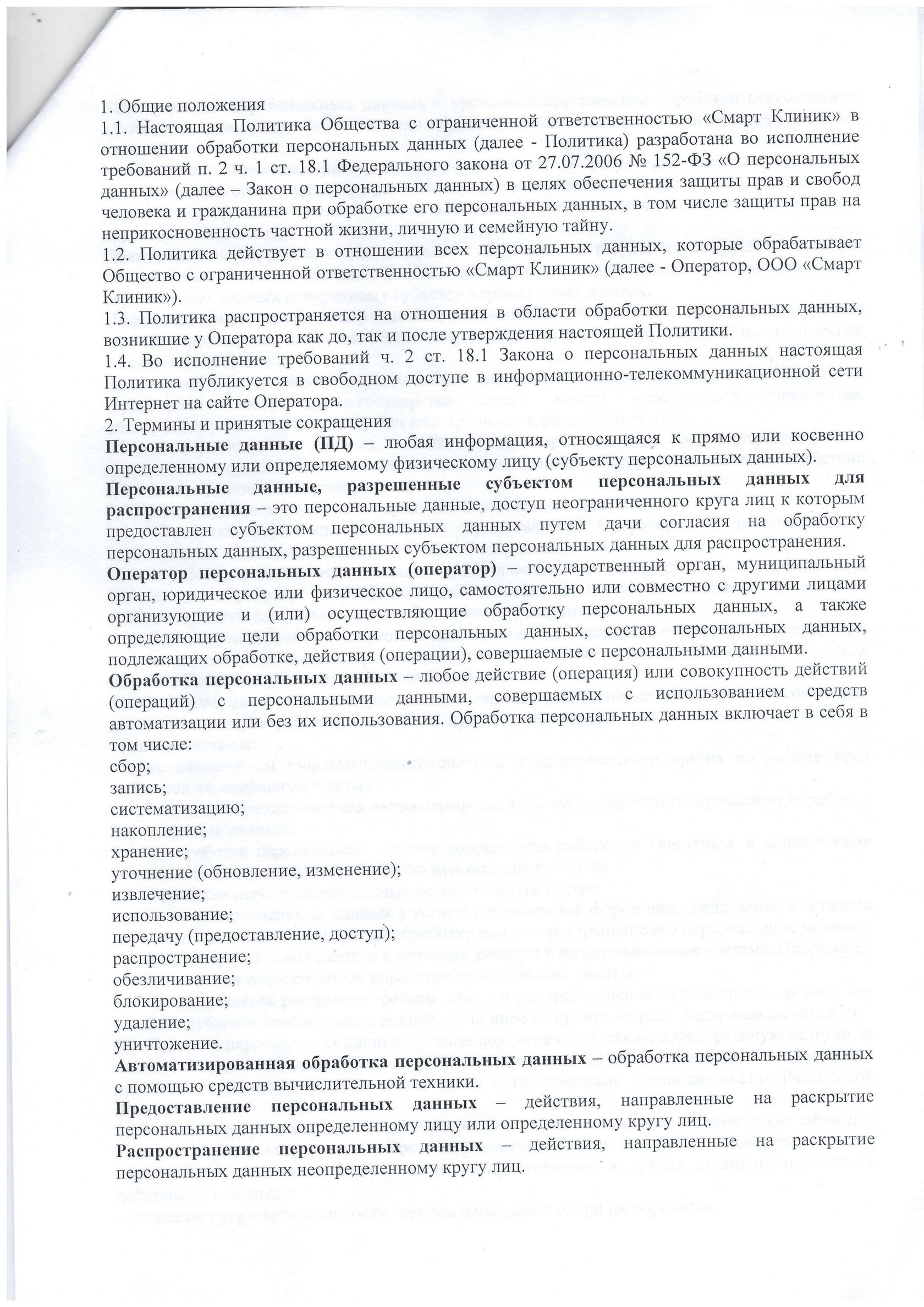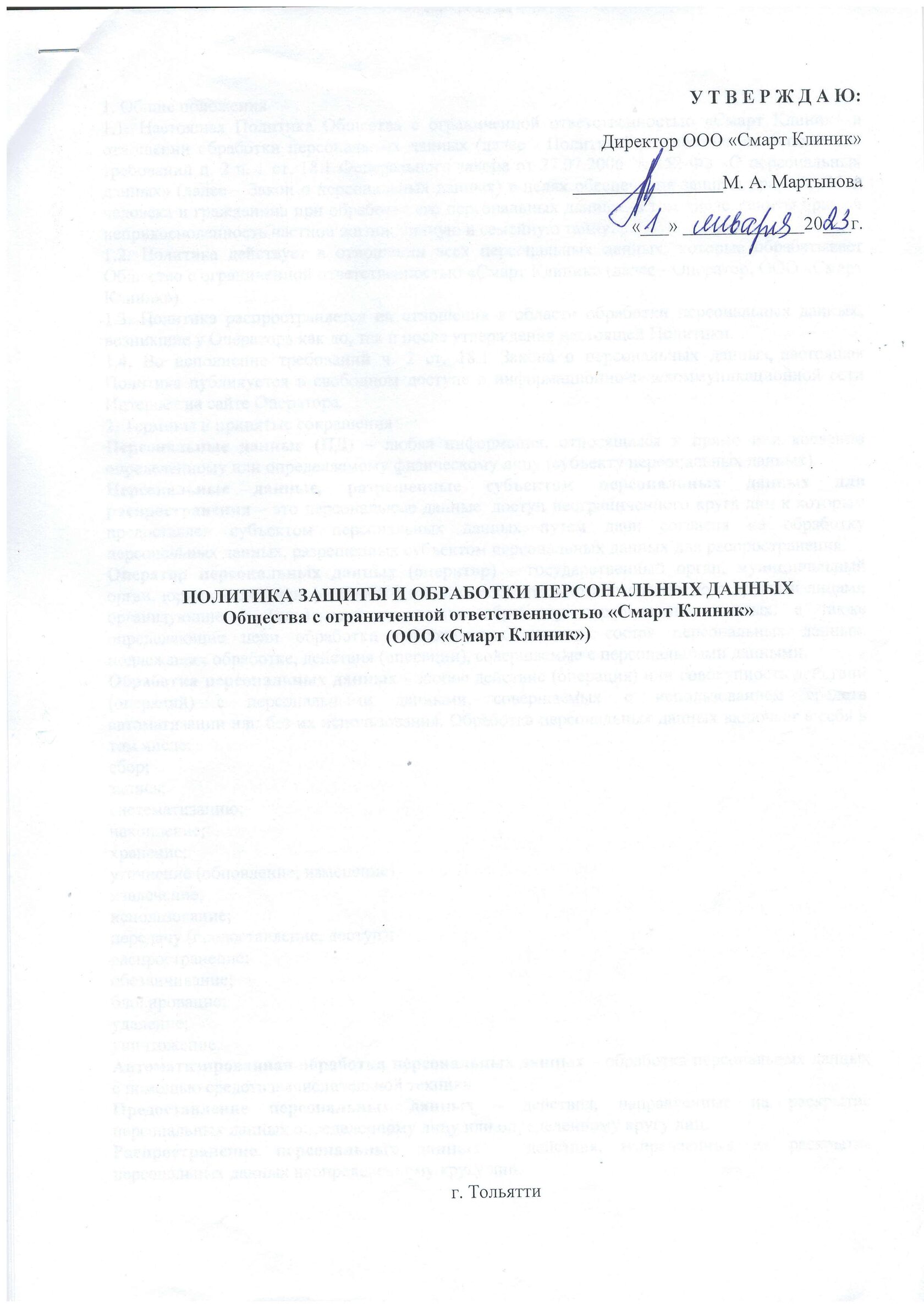 Политика ООО «Смарт Клиник» в отношении обработки и защиты персональных данных